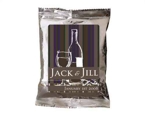 This frothy, iced cappuccino drink is sure to be a rich and refreshing guest pleaser. The single serving pouches are sealed in elegant silver pouches which can be personalized with your names and event date along with your choice of one of our premium designs from our extensive design library. You are sure to find a design that perfectly complements your event theme and style. Package Contents: single serving 1 oz package of cappuccino powder Package Size: 4 wide x 6.5 tall Instructions: Just add milk or water and pour over ice. Note: Tag or Sticker does not come attached to item. ... This unique & elegant item is part of our exclusive Wedding Favor and Bridal - Baby Shower collection. They make for a great and unique gift for your wedding reception, bridal shower, bay shower or any other special event.