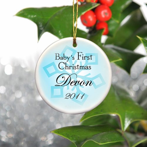 Wedding Favor - Bridal Shower Gift - Baby Shower Keepsake: Celebrate the first Christmas of that precious bundle of joy with our pretty personalized holiday ornaments. A delicate addition to any tree, our Baby Boy's First Christmas ceramic snowflake-adorned ornaments feature a blue background with two different designs. Start a tradition and hang this unique personalized First Christmas ornament on the tree every year Ornaments measure 3" in diameter and are ready for hanging with a gold metallic cord. Personalize with baby's name of up to 15 characters and holiday year.