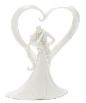 Framed in a romantic heart, this stylish couple are the picture of Love. Designed to add glamour to any cake. Glazed porcelain. 4" Long, 5.75" Tall, Weight: 7.2 oz, Base: 4-1/8 x 2-3/8