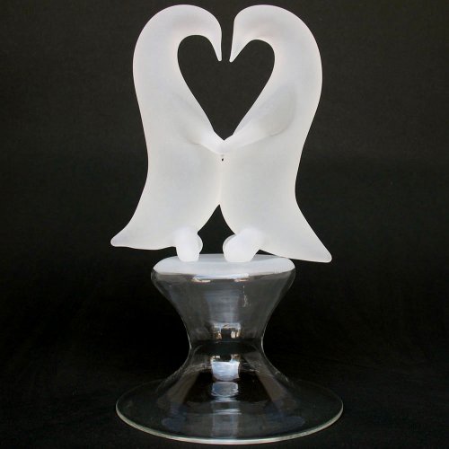Dancing penguins wedding cake topper of hand blown glass will top off your celebration in brilliant crystal. Artist is Kevin Prochaska, Disneyland glass blower for 10 years.Representing love, unity and devotion, this unusual wedding cake topper features a pair of frosted crystal penguins forming the shape of a heart. The penguin bride and groom hold each other's hands while dancing on top of a snow capped pedestal style base. Penguins and snowy top of base are permanently etched with sand to achieve the soft frosted look. A simply beautiful keepsake that is perfect for that special day, I craft the entire piece from borosilicate crystal for strength and durability. Topper measures 7.5 inches tall, 4.5 inches wide and will not overpower a smaller wedding cake. Base diameter at bottom is 4 inches across for added stability.
